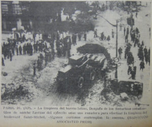 Enfocándonos en los meses de mayo y junio de 1968 -durante los cuales estalla en Francia un breve pero intenso movimiento social que amenazó al poder del Presidente Charles de Gaulle y a la V República- trataremos de analizar la representación de los estudiantes franceses en la prensa diaria uruguaya. Esta da cuenta de los acontecimientos a medida que se van desarrollando, mediante cables telegráficos de las grandes agencias de prensa internacionales, numerosas fotografías, y algunos editoriales y artículos de opinión. Presentaremos en primer lugar el llamado “Mayo francés”, así como el contexto latinoamericano y uruguayo. Uruguay, pequeño país que enfrentaba en 1968 su propio movimiento estudiantil y obrero, estaba atravesando una profunda crisis económica, política y social, que llevó en 1973 a un golpe de Estado y a la instauración de un régimen dictatorial. Luego, nos interesaremos en la prensa uruguaya: no sólo su contenido, sino también su estructura y su forma, que condicionan la representación de los estudiantes franceses. El estudio de este caso especifico permitirá además reflexionar sobre cuestiones más amplias, tales como la construcción del evento mediático por los “medios masivos”, o la búsqueda de una supuesta “objetividad” por parte de los periodistas. Intentaremos entonces pensar la noticia no como el mero reflejo de la realidad -para los periodistas de agencias- o de una opinión -para los editorialistas-, sino como un objeto complejo, producto de la articulación de factores tecnológicos, culturales, políticos y económicos. A la hora de las redes sociales y de las fake news, el estudio de este pasado parece tener una particular vigencia presente.